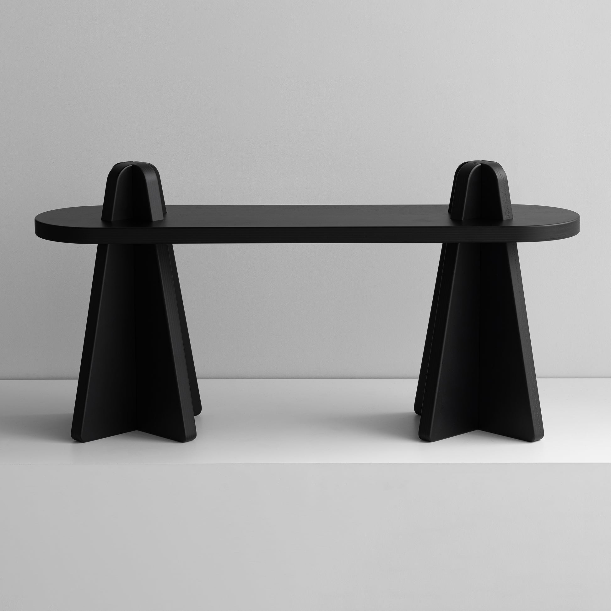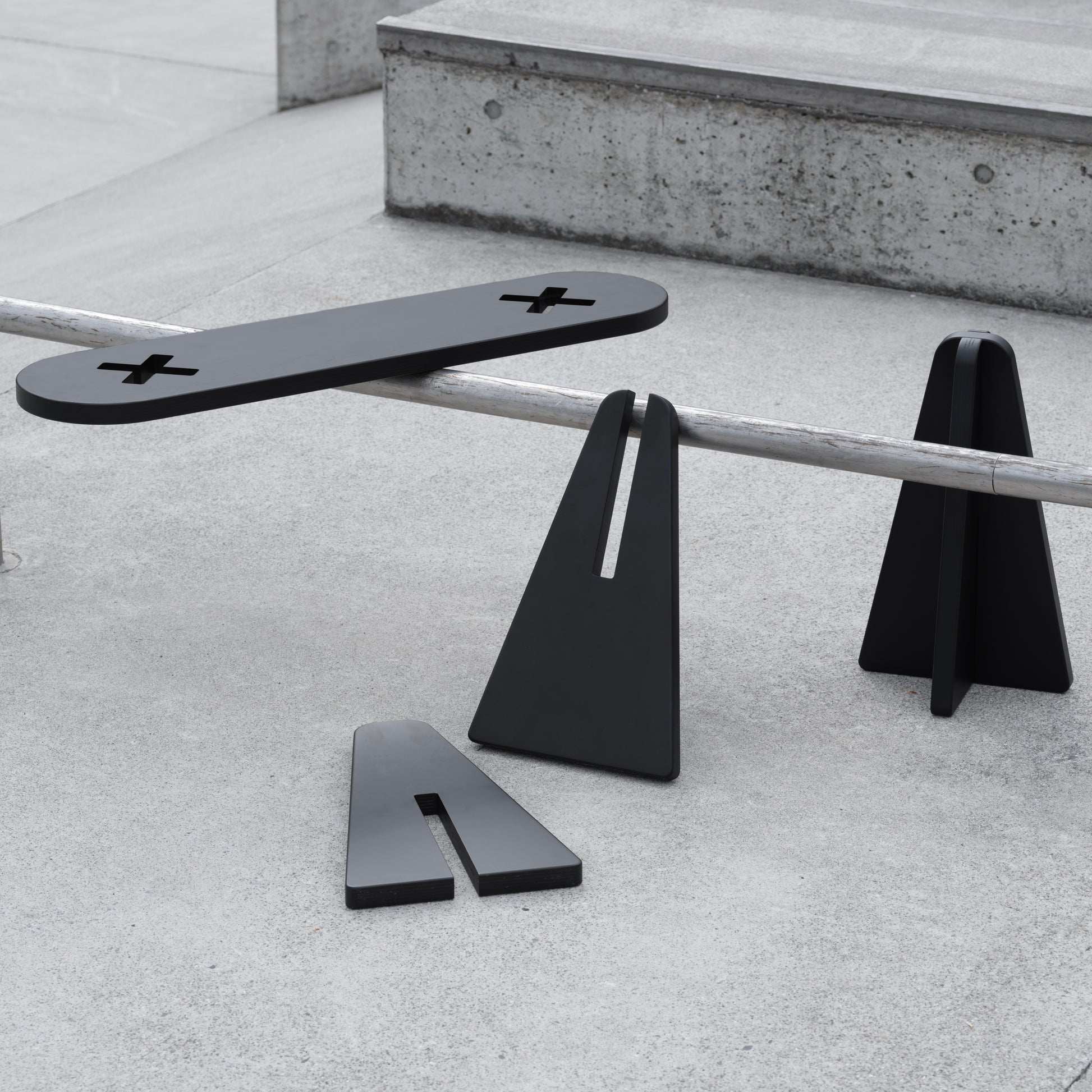 DECK TYPE – TWO is the iconic dual option piece that works as a shelf or bench-like stool when you slot two trapezoidal legs into the X-shaped opening of the “deck” top plate.