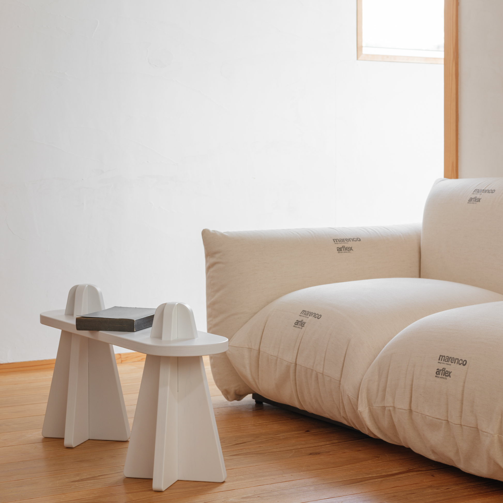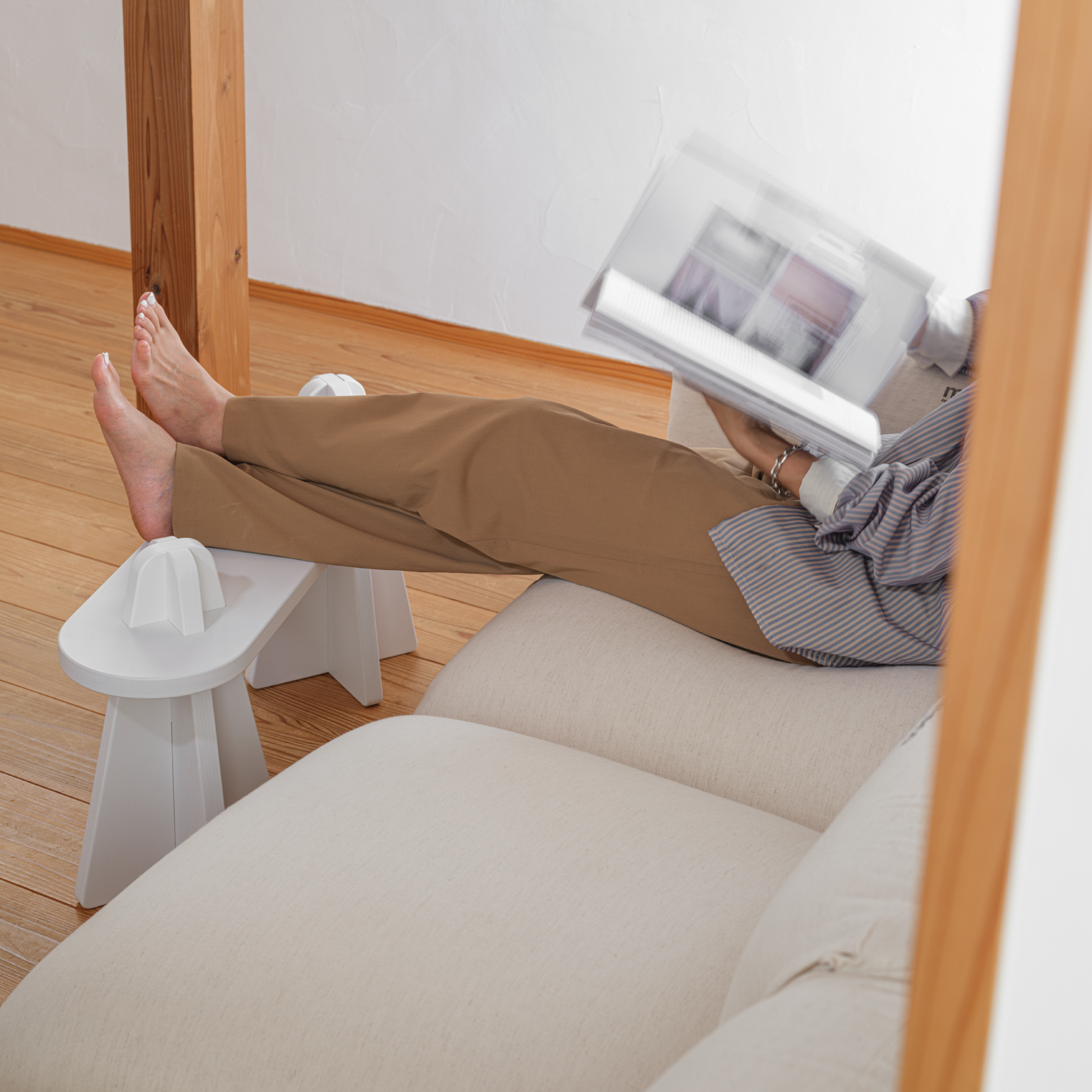 スケートボードを彷彿とさせるデッキタイプは座るだけでなく、スニーカーと植物や本とグッズ類などお気に入りの物を置いて飾るのにも適しており、ソファサイドにセットすればサイドテーブルへ足を載せればオットマンと、工夫しだいで様々な使い方ができます。