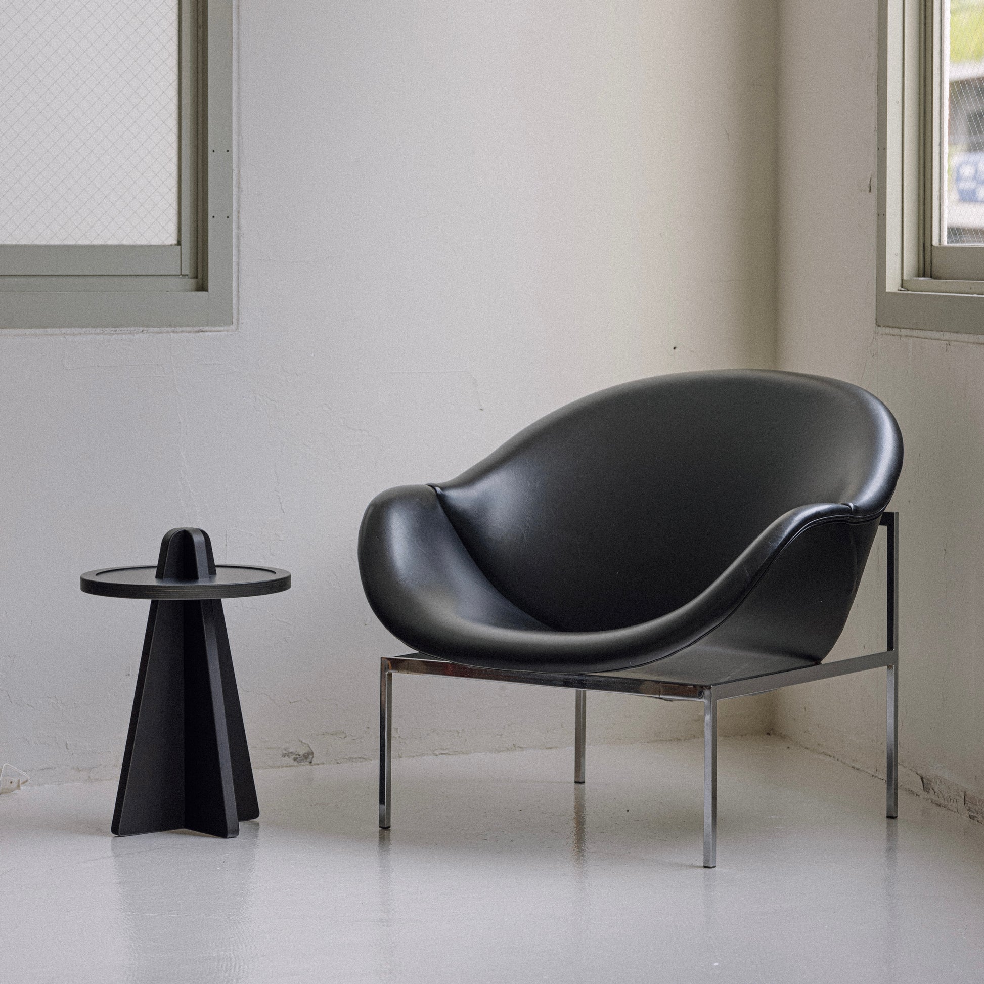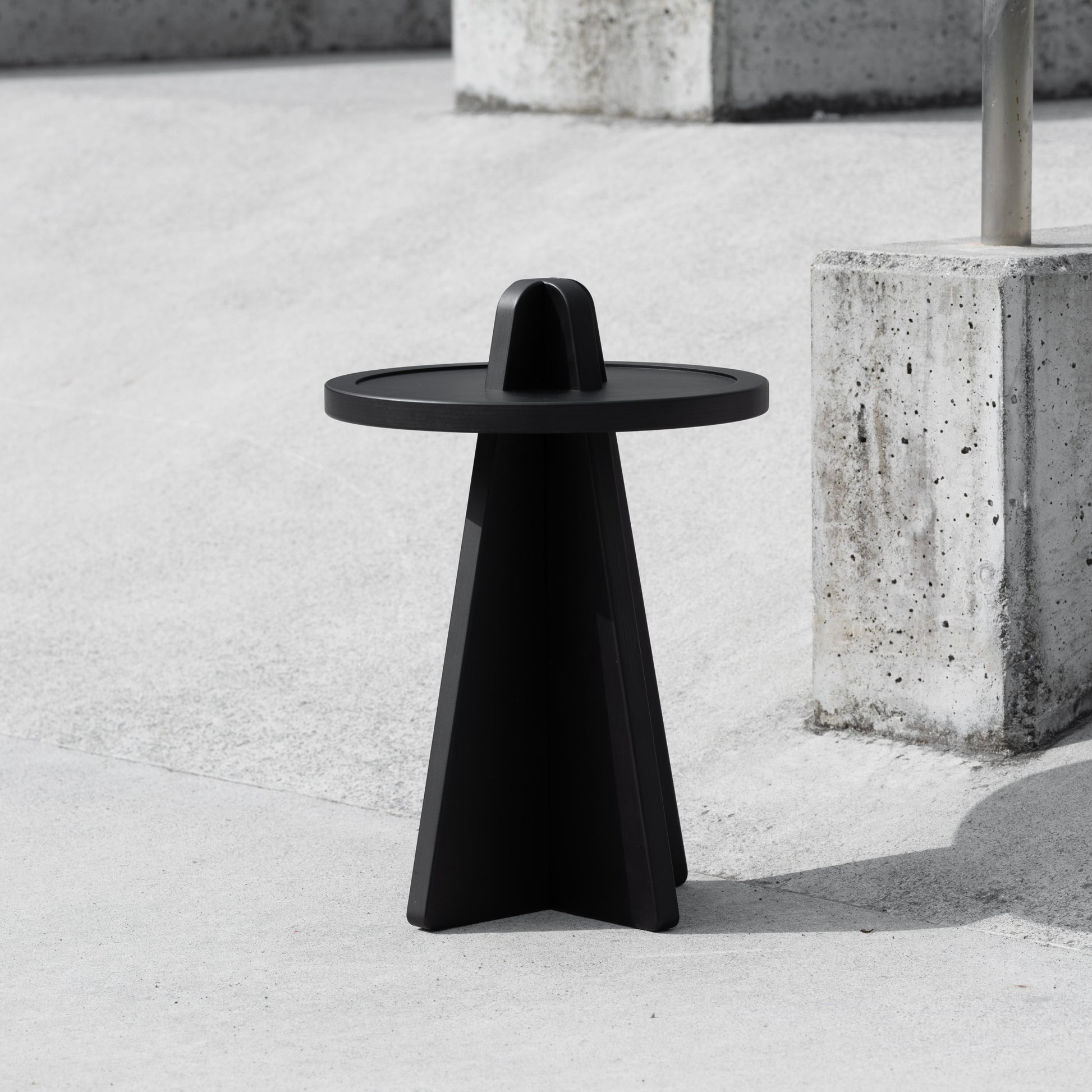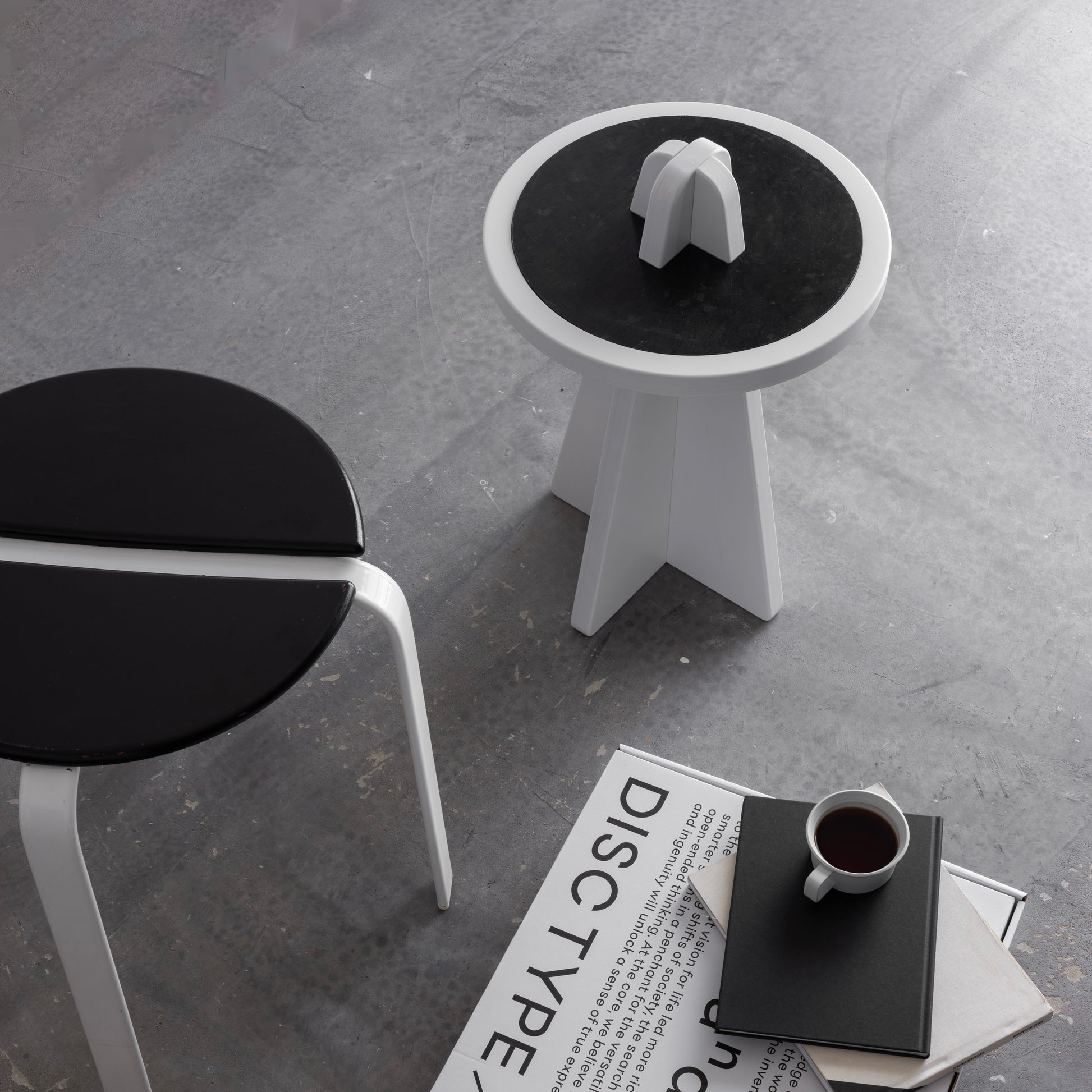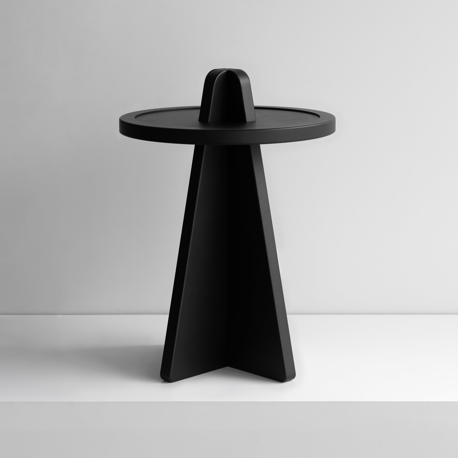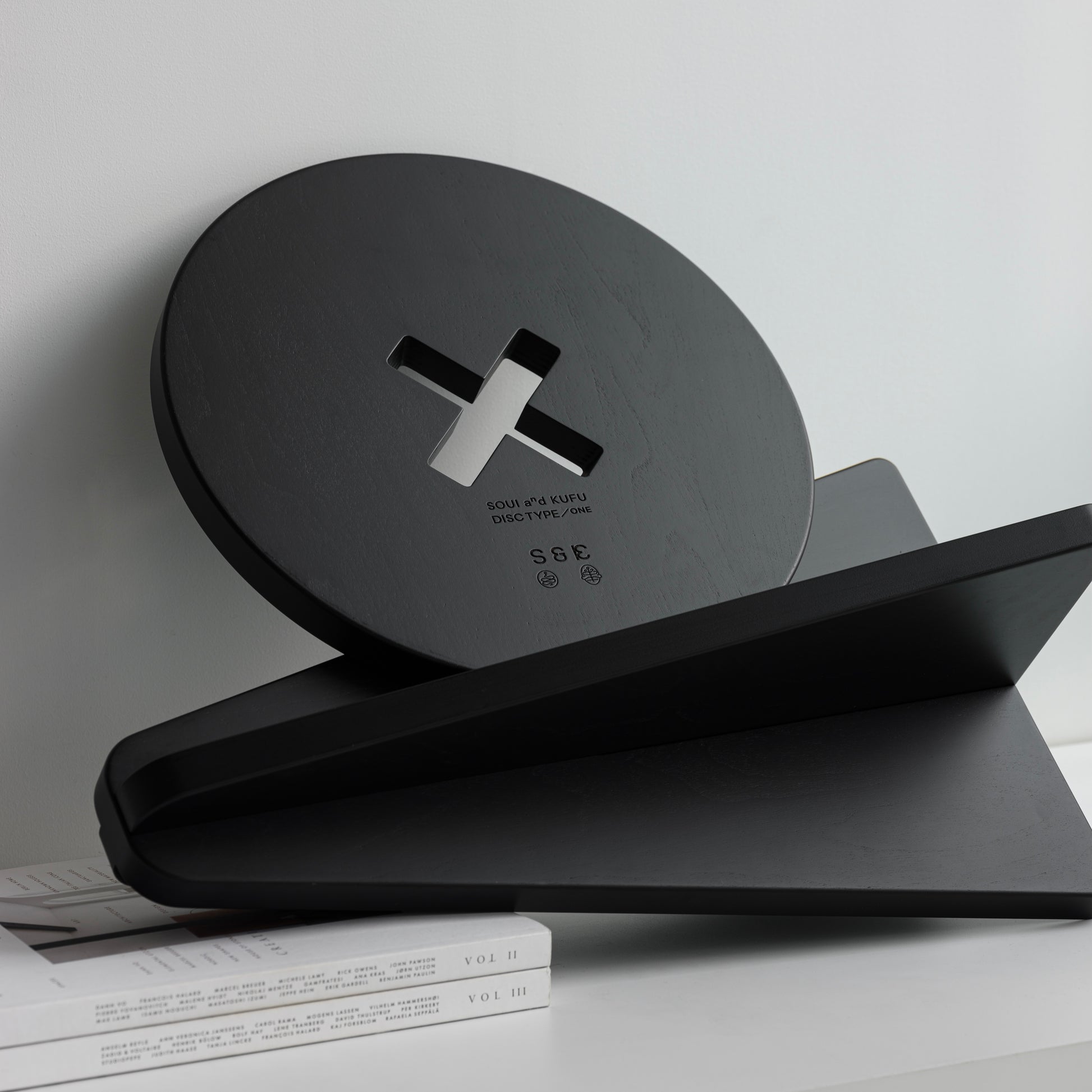 DISC TYPE – ONE is the side table with iconic protruding top that comes together when you slot two trapezoidal legs with the X-shaped opening of the “disc” top plate.